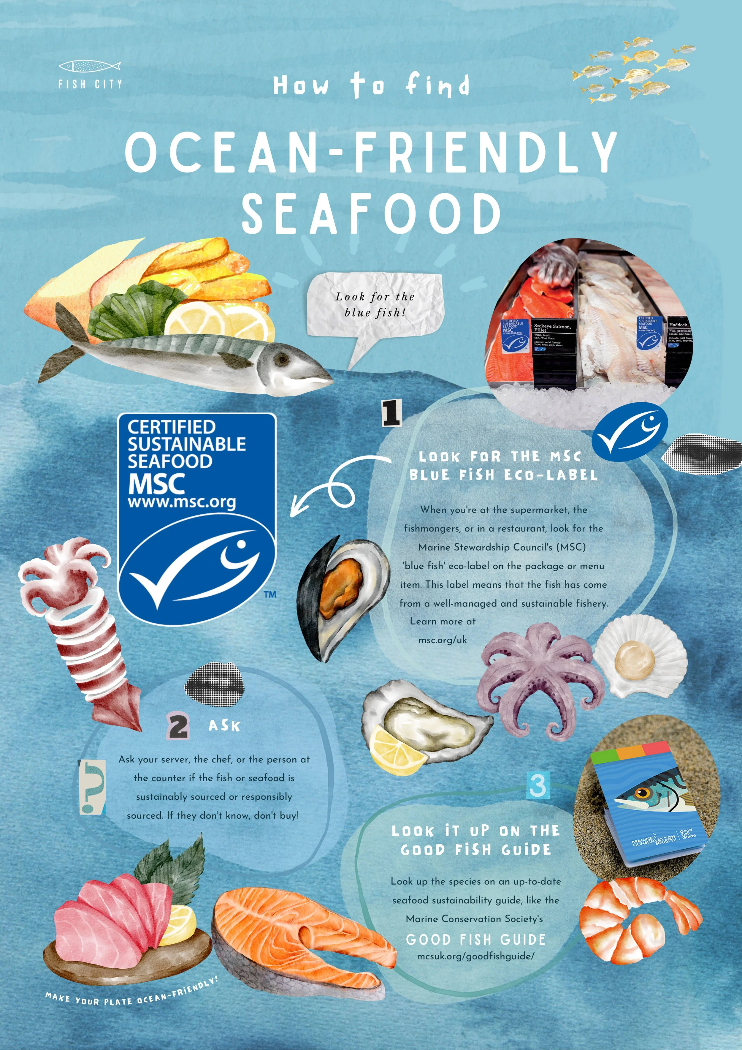 For wild fish: the ‘Blue Fish’ label from the Marine Stewardship Council (MSC).