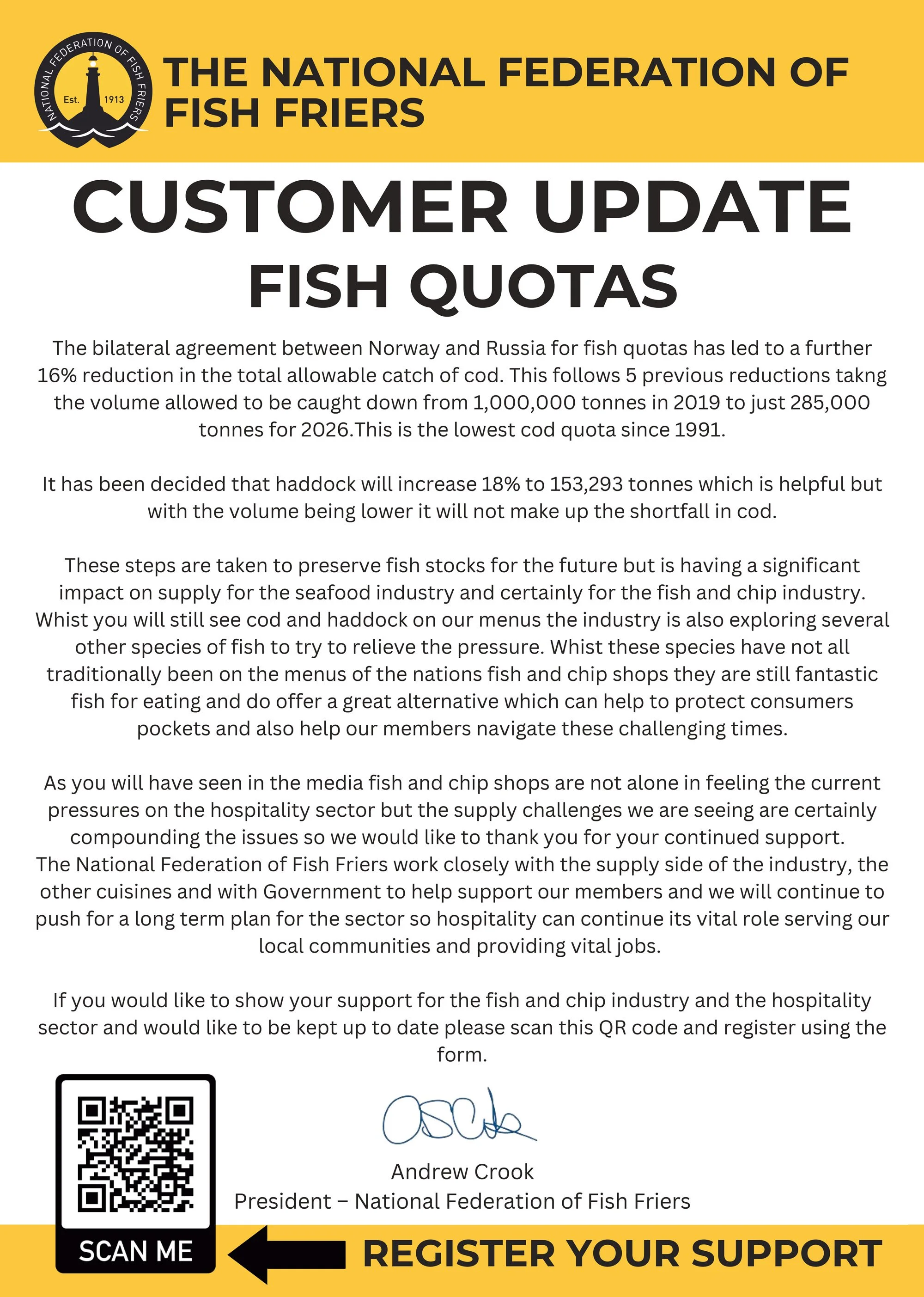 As you will have seen in the media, fish and chip shops are not alone in feeling the current pressures on the hospitality sector, but the supply challenges we are seeing are certainly compounding the issues, so we would like to thank you for your continued support. The National Federation of Fish Friers work closely with the supply side of the industry, the other cuisines and with Government to help support our members and we will continue to push for a long term plan for the sector so hospitality can continue its vital role serving our local communities and providing vital jobs.
